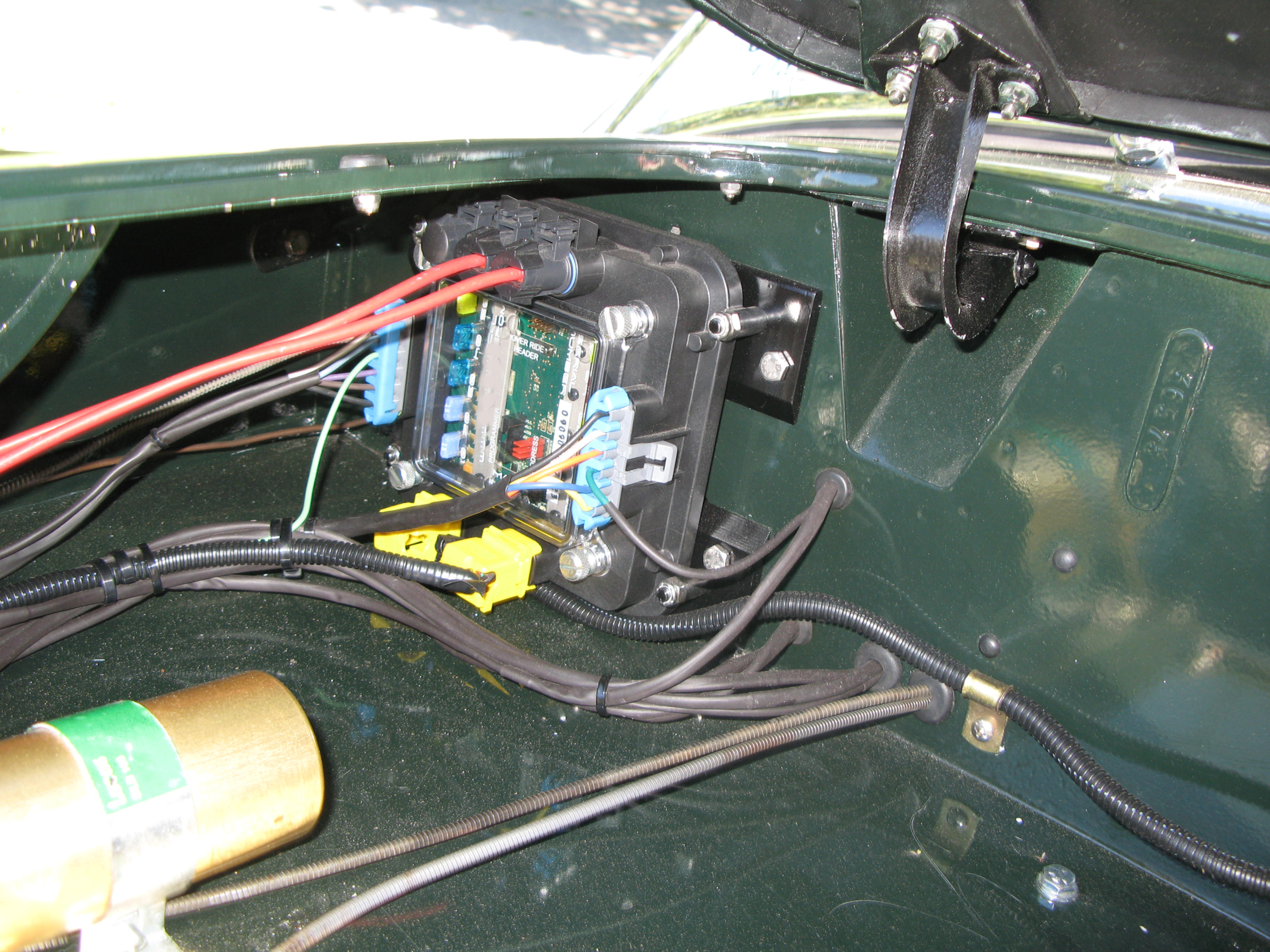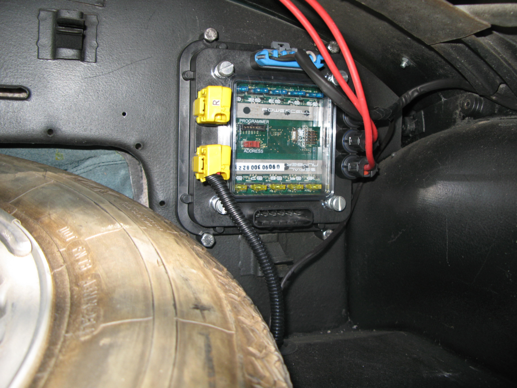 The front POWERCELL is mounted on the firewall under the hood. It is powering the headlights, high-beams, ignition coil, wipers, turn signals, parking lights, fog lights and the horn. This is a great location. The wiring is short, the fuses are accessible and it is very clean. Here’s a picture of the front POWERCELL.