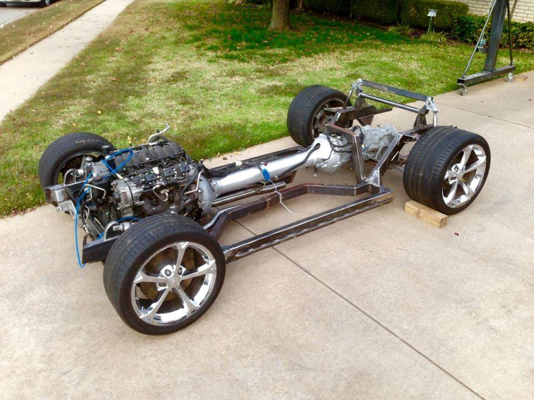 Richard has been building his KONGQUEST for several years.  It is a late 1980’s Conquest with a complete Corvette drive train under the body.  He has done a remarkable job building the chassis and even integrating in the Torque Tube into the system.  Here you can see the chassis of the car.