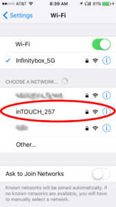Each inTOUCH NET broadcasts its own unique network name. For these instructions the inTOUCH NET that we are using will be inTOUCH_257. Yours will be different so check the configuration sheet that came with your inTOUCH NET. Make sure that your Infinitybox system is properly connected and powered up. It may take up to 1 minute after the system is powered up before the inTOUCH NET network name shows up.