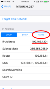 Write down the IP Address and the Subnet Mask shown on the screen. These will be unique to your inTOUCH NET and may not be the same as numbers shown in the picture below. Once you have written this down, press the Static button as shown in this picture.