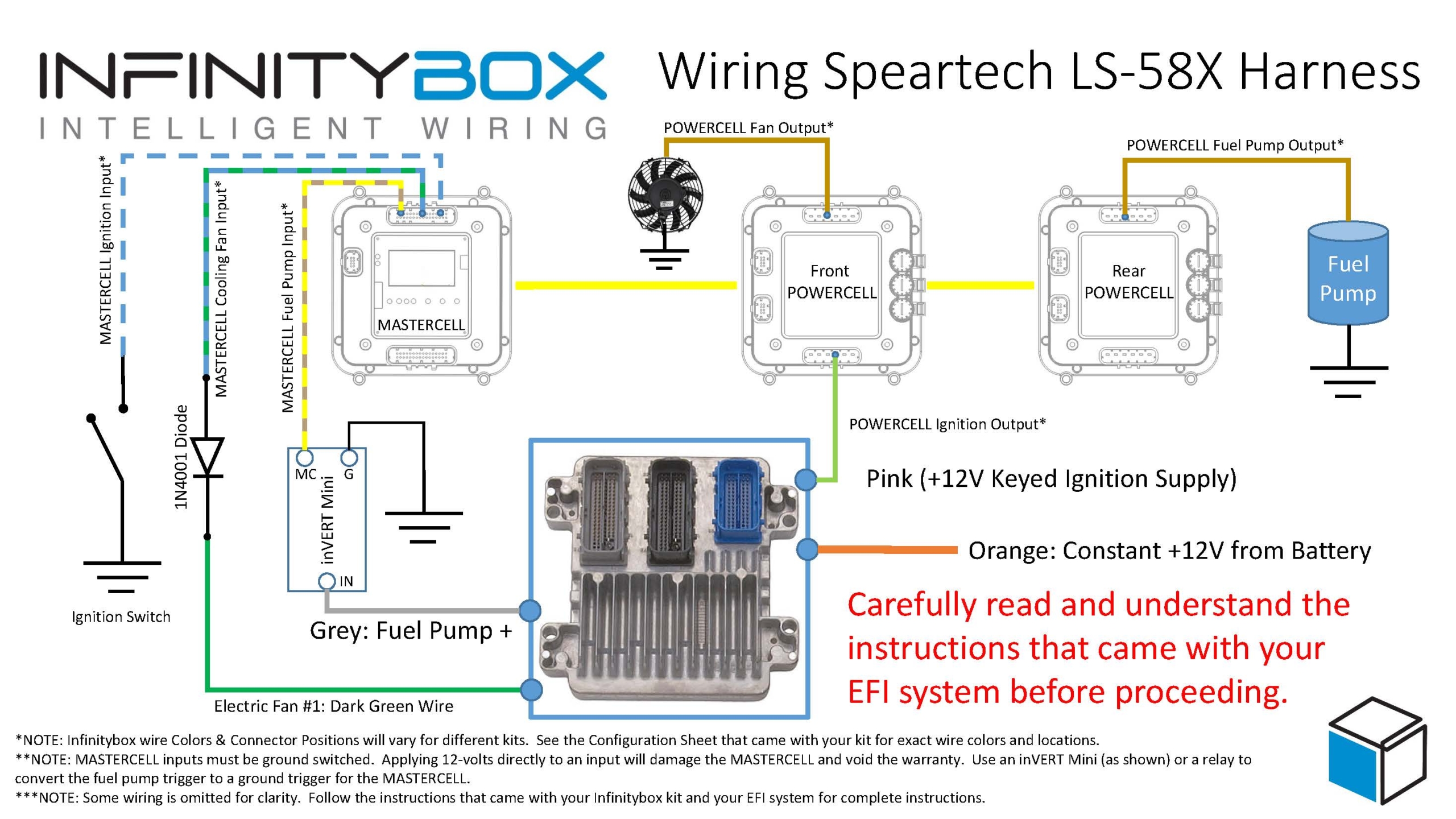 In the case of the Speartech LS-58X engine harness, your Infinitybox system is going to provide the switched key-on ignition power.  It will also take the triggers for the cooling fan and the fuel pump from the ECU.  That way you can use the Infinitybox system to eliminate the need for external relays for your fuel pump and cooling fans.