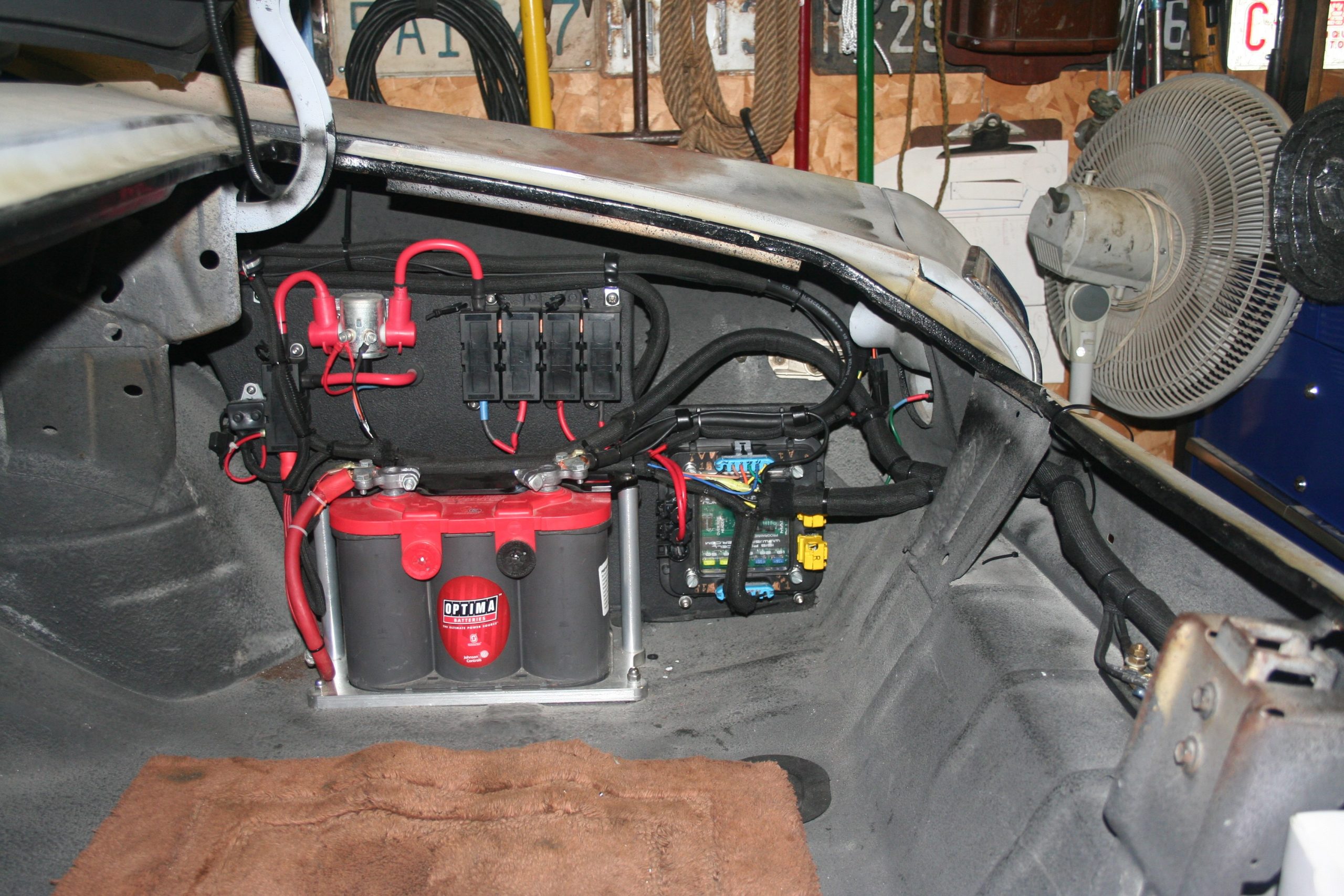 You can see this picture of his rear POWERCELL and the inRESERVE solenoid protecting his battery.  The rear POWERCELL is mounted conveniently in the rear, right corner of the car.  This is very accessible if he needs to change a blown fuse, the runs of wire are short and it can be hidden neatly behind the custom trim piece that he made.
