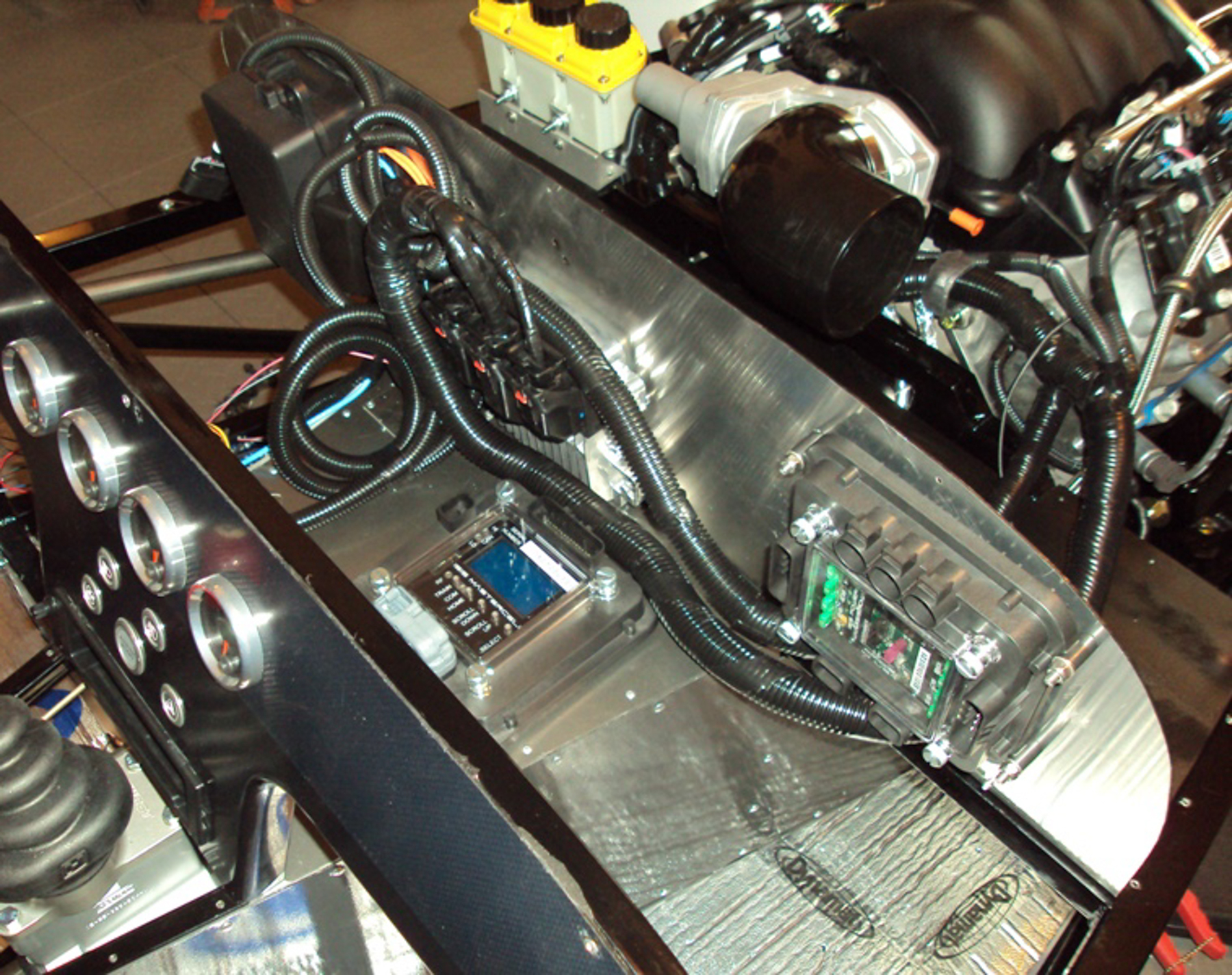 Mike wired the car with our 20-Circuit Kit and inLINK. The benefit to him was simplifying the wiring, reducing the total amount of wire and giving the flexibility with making changes over his project. He mounted his MASTERCELL and front POWERCELL just forward of the dash board. Here is a picture of him laying these out.