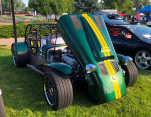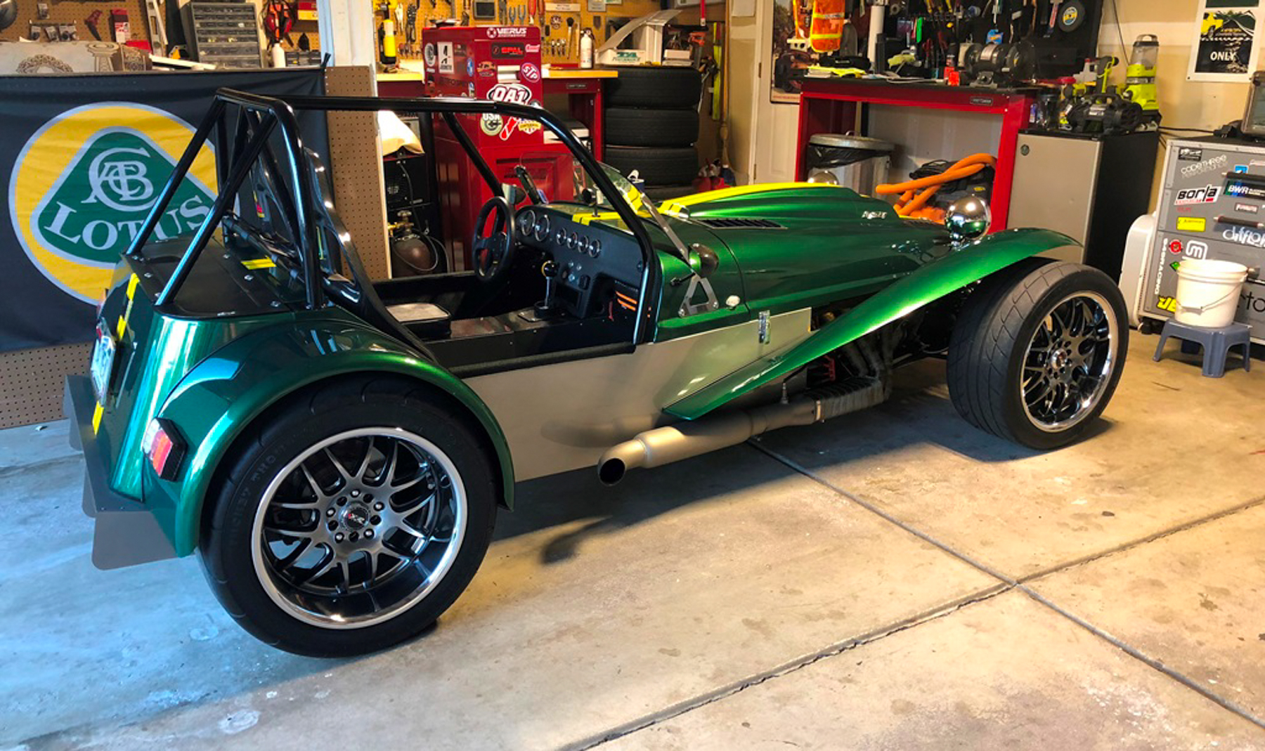 He handcrafted the rear fenders, back panel, cover and rear diffuser out of aluminum. He custom made the flared wings out of fiberglass. On top of all of that, he painted it Lotus Racing Green with a yellow racing stripe. The LS3 is mated to a T-56 6-speed and the brakes are disc from Wilwood.
