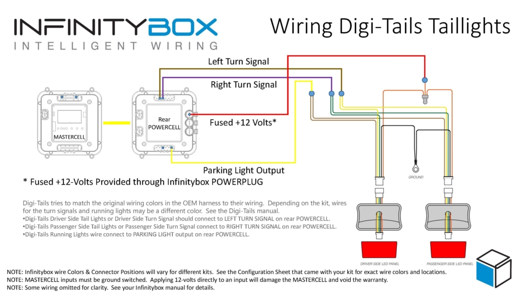 - Their Passenger Side Tail Lights or Passenger Side Turn Signal should connect to the RIGHT TURN SIGNAL from your rear POWERCELL. In most Infinitybox kits, this is the violet wire but always check your configuration sheet.