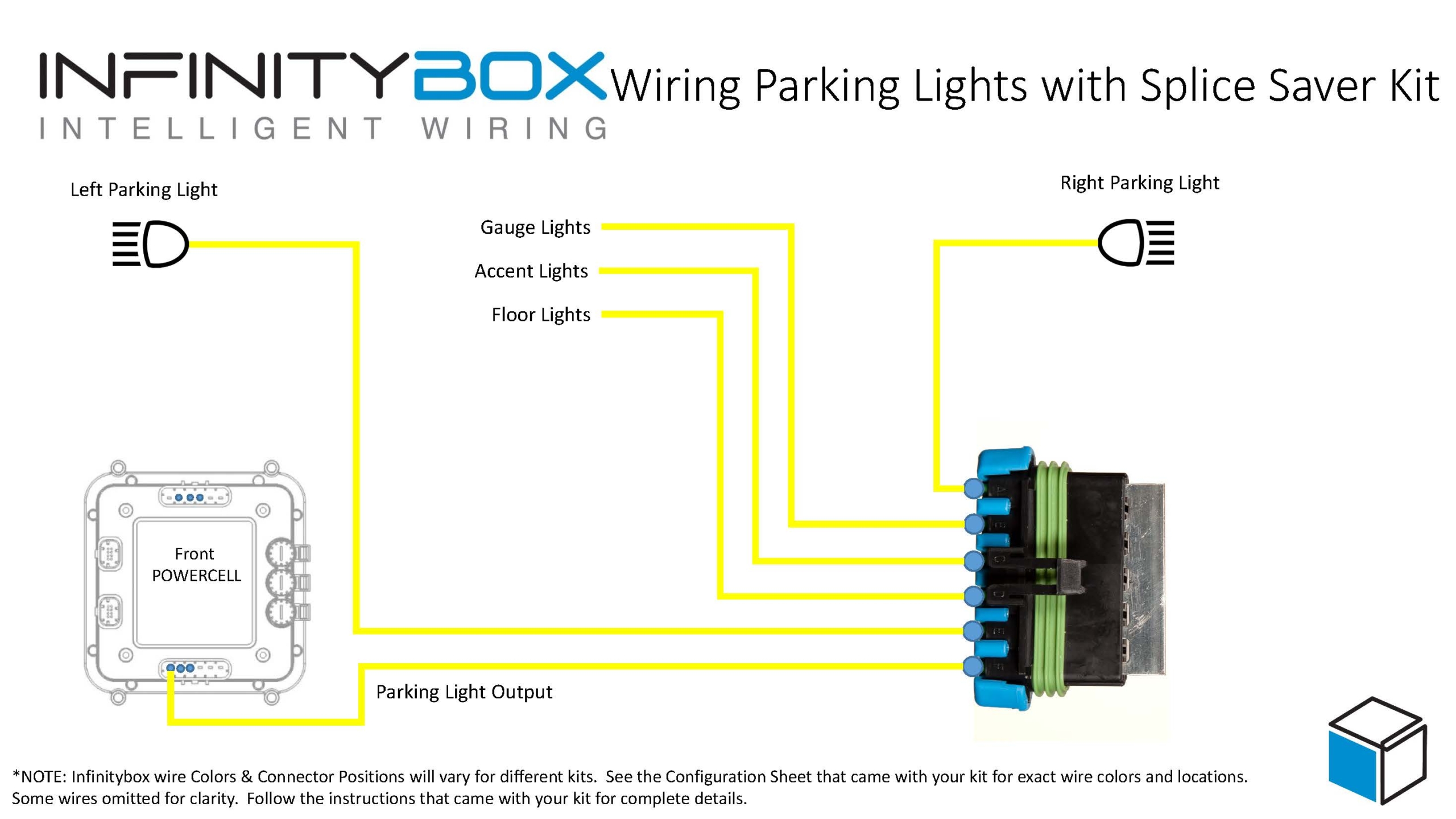 Wire diagram showing how to wire front parking lights and illumination with the Infinitybox Splice Saver Kit