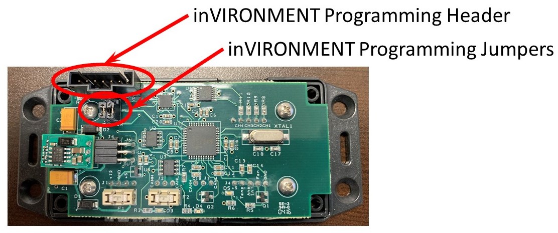 - Identify the Programming Header Connector and the Programming Jumpers. This picture will show you where they are on the inVIRONMENT board.