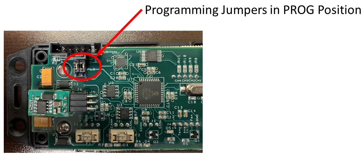 - Move the two Programming Jumpers from the RUN position to the PROG position. The PROG position puts the two jumpers on the pins closest to the Programming Header. You can use a pair of needle-nose pliers or a pair of tweezers to remove these jumpers and move them to the PROG position. FAILURE TO DO THIS STEP WILL DAMAGE THE inVIRONMENT PROCESSOR AND WILL VOID THE WARRANTY. This picture will show you the jumpers in the PROG position.