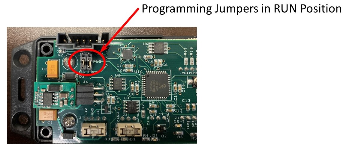 - Move the Programming Jumpers back to the RUN position. The RUN position puts the two jumpers on the pins furthest from the Programming Header. This picture will show you the correct position.