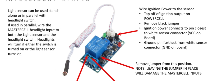 To do this, you can use practically any light sensor. It just needs to make a connection when the light level gets dark. You are going to use this connection to ground the MASTERCELL input for the headlights. Remember that the MASTERCELL triggers an output on a POWERCELL when the input wire is grounded.