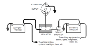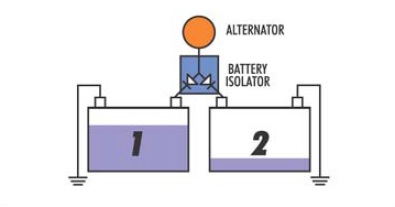 The battery isolator stops current from flowing between the two batteries while allowing both to charge safely from the alternator. This picture shows how most battery isolators are wired between the alternator and the bank of batteries.