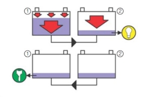 In most cases, you want to have a battery in your car or truck that powers all of the main functions. These functions include your ignition, starter, lighting, fans, fuel pumps, horn and turn signals. You also may want to add a second battery just to power the high-wattage demand of your stereo. This second battery would power the amp and sub-woofer. You may also want this second battery to power any other A/V equipment like TV’s and gaming consoles. This way you can take your car to a show or take it tailgating, use your stereo and not risk running down the main battery that starts the car. The problem is that in some cases, two batteries wired together can cause problems. If one battery is weaker than the other, it can rob charge from the stronger battery. This picture shows how this happens.
