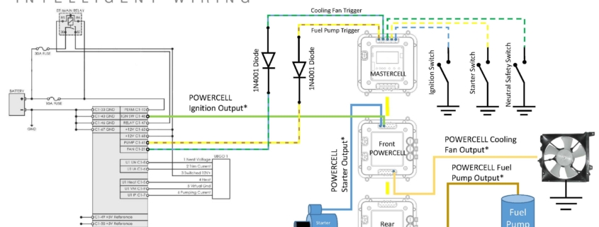 When the ECU sends the signal to turn on the cooling fan, the MASTERCELL input will get the trigger. The MASTERCELL will send a command to the front POWERCELL to turn on the cooling fan. This lets you eliminate the cooling fan relay in the AEM harness.